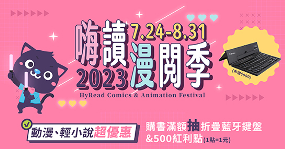 2023嗨讀漫閱季 7/24~8/31 動漫、輕小說超優惠,購書滿額抽折疊藍牙鍵盤、500紅利點! 答題領100,造句傳情抽人蔘抱枕!