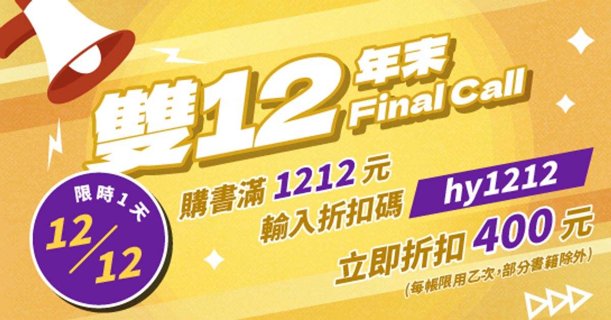 12/12只有1天,輸入折扣碼現折400! ● 活動期間:2025/12/12(只有一天) 購書折扣碼:hy1212(訂單滿1212元可折抵400元) ● 活動辦法: 1) 折扣碼每個會員帳號限使用乙次,折價券使用效期:2025年12月12日00:00~23:59止(以12/12只有1天,輸入折扣碼現折400! ● 活動期間:2025/12/12(只有一天) 購書折扣碼:hy1212(訂單滿1212元可折抵400元) ● 活動辦法: 1) 折扣碼每個會員帳號限使用乙次,折價券使用效期:2025年12月12日00:00~23:59止(以12/12只有1天,輸入折扣碼現折400! ● 活動期間:2025/12/12(只有一天) 購書折扣碼:hy1212(訂單滿1212元可折抵400元) ● 活動辦法: 1) 折扣碼每個會員帳號限使用乙次,折價券使用效期:2025年12月12日00:00~23:59止(以