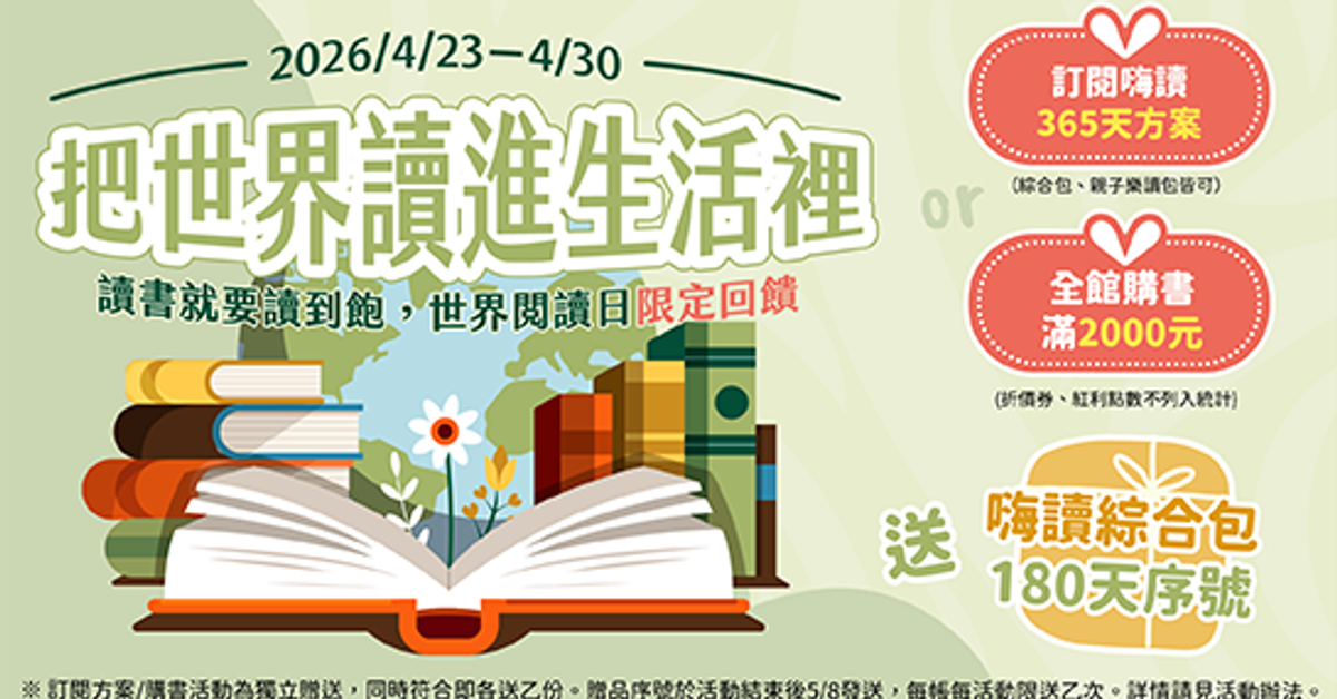 4/23-4/30訂閱/購書送180天綜合包 讀書就要讀到飽,世界閱讀日限定回饋! ● 活動期間:2026/4/23-4/30(以台灣時區 UTC/GMT+8為準)。 ● 活動內容: 1.訂閱嗨讀365天方案,加送嗨讀綜合包1804/23-4/30訂閱/購書送180天綜合包 讀書就要讀到飽,世界閱讀日限定回饋! ● 活動期間:2026/4/23-4/30(以台灣時區 UTC/GMT+8為準)。 ● 活動內容: 1.訂閱嗨讀365天方案,加送嗨讀綜合包1804/23-4/30訂閱/購書送180天綜合包 讀書就要讀到飽,世界閱讀日限定回饋! ● 活動期間:2026/4/23-4/30(以台灣時區 UTC/GMT+8為準)。 ● 活動內容: 1.訂閱嗨讀365天方案,加送嗨讀綜合包180