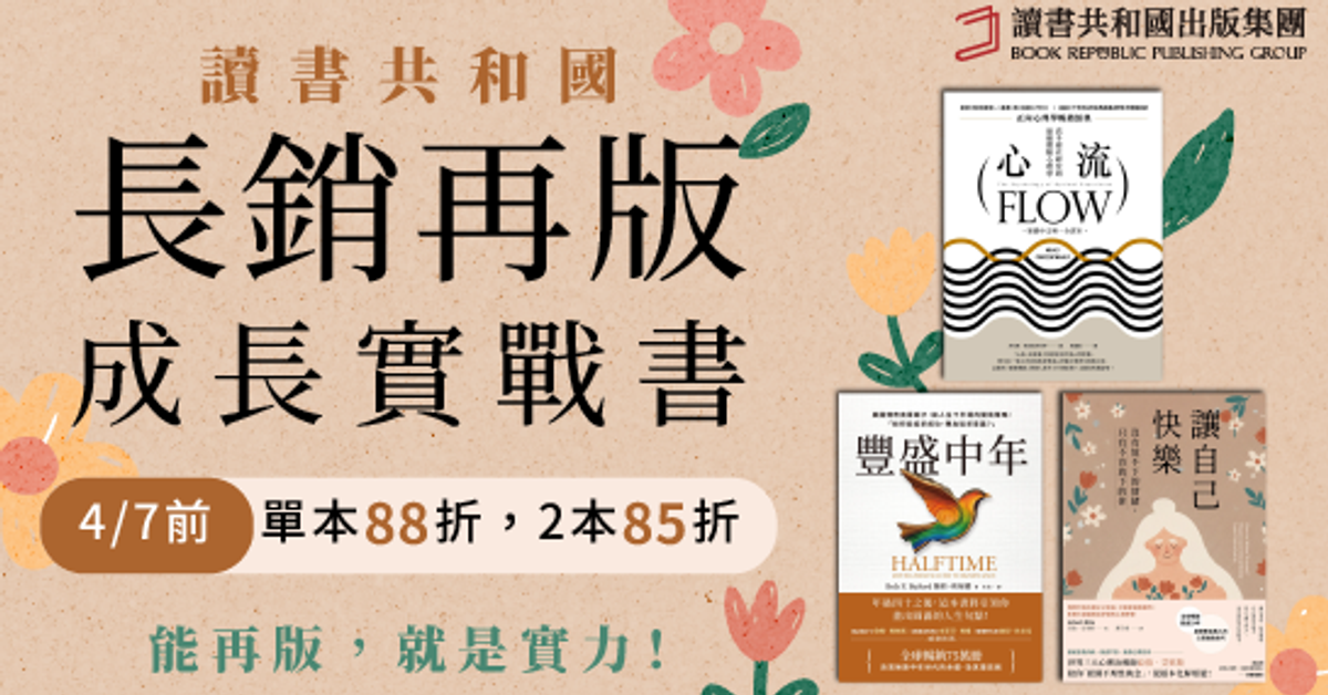 4/7前,單本88折,2本85折 這些書「好到必須一直存在」。從人際對話、內在整理到自我效能,精選長銷再版的成長經典,給自己一趟升級旅程吧。 ※活動說明:115/4/7前,單本88折,2本85折。全館活動期間,符合全館活動條件時依全館折扣(不重複優惠),結帳依購物車實際4/7前,單本88折,2本85折 這些書「好到必須一直存在」。從人際對話、內在整理到自我效能,精選長銷再版的成長經典,給自己一趟升級旅程吧。 ※活動說明:115/4/7前,單本88折,2本85折。全館活動期間,符合全館活動條件時依全館折扣(不重複優惠),結帳依購物車實際4/7前,單本88折,2本85折 這些書「好到必須一直存在」。從人際對話、內在整理到自我效能,精選長銷再版的成長經典,給自己一趟升級旅程吧。 ※活動說明:115/4/7前,單本88折,2本85折。全館活動期間,符合全館活動條件時依全館折扣(不重複優惠),結帳依購物車實際